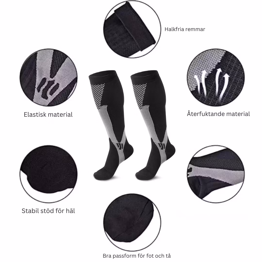 Strumporna erbjuder gradvis kompression (15–21 mmHg) som stabiliserar fot, ankel och vad. Detta förbättrar blodflödet, minskar muskeltrötthet och svullnad samt främjar snabbare återhämtning efter löpning, gym, padel eller andra intensiva pass.