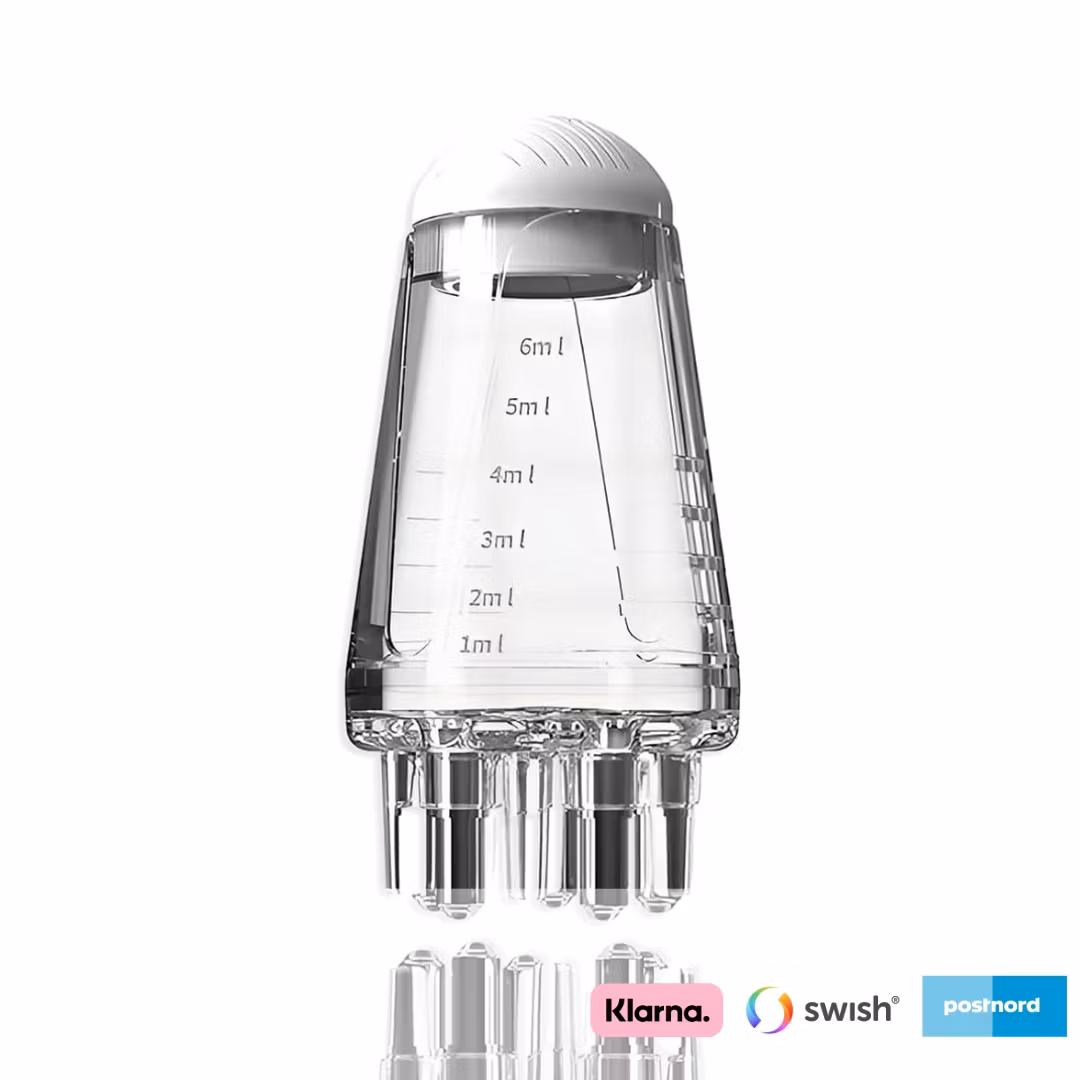Med noggrant utformade funktioner som en kap för hygieniskt förvaring och en exakt skala för dosering, tar denna applikator hårvård och medicinering till nästa nivå. De elastiska, rullande kultänderna sprider vätskan jämnt, medan det klämbara handtaget ger dig full kontroll över mängden produkt som används – utan kladd eller spill.