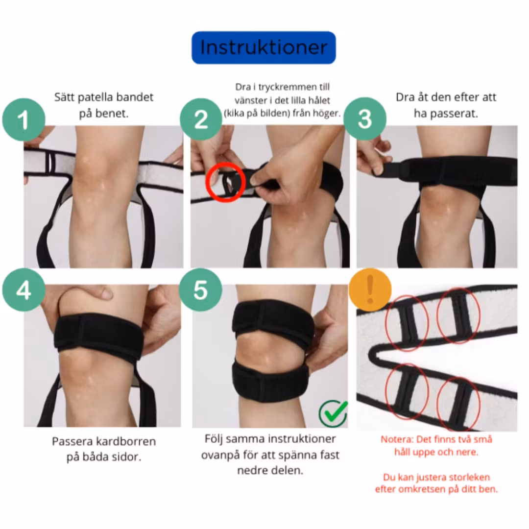 Detta knäskyddsband är utmärkt för aktiviteter som fitness, basket, löpning, bergsklättring och ridning. Om du har svullnad i knät rekommenderas en större storlek för optimal komfort.
